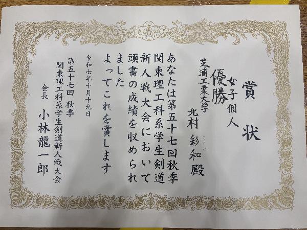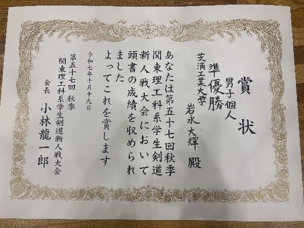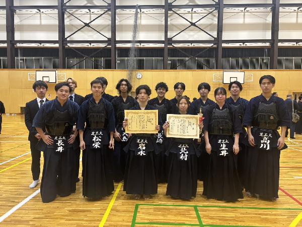 2025年10月19日 第57回関東理工科系学生剣道新人戦大会が開催され、個人優勝、準優勝の成績をおさめました 女子個人 優勝 北村彩和(建築学部2年) 男子個人準優勝 岩永大輝(土木課程2年) 女子個人は2名、男子個人は3名出場し、それぞれ大健闘でした。 男子団体は、緒戦で農大(優勝校)に敗れました。